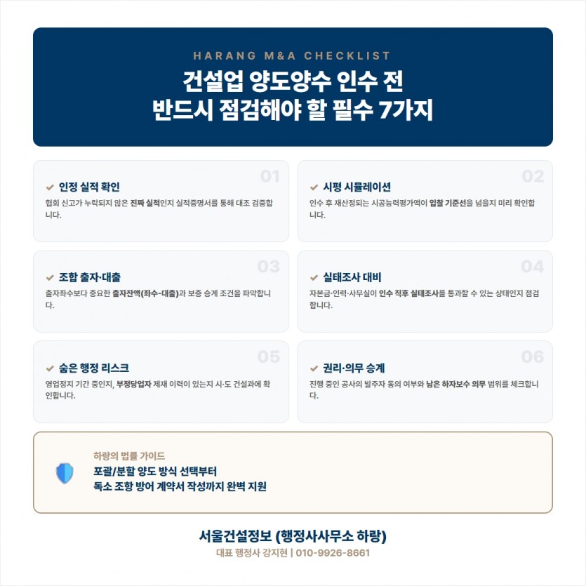 양도양수 계약 전에 확인하지 않으면 인수 후 등록기준 미달, 행정처분 승계, 공제조합 부담 같은 문제가 터집니다.