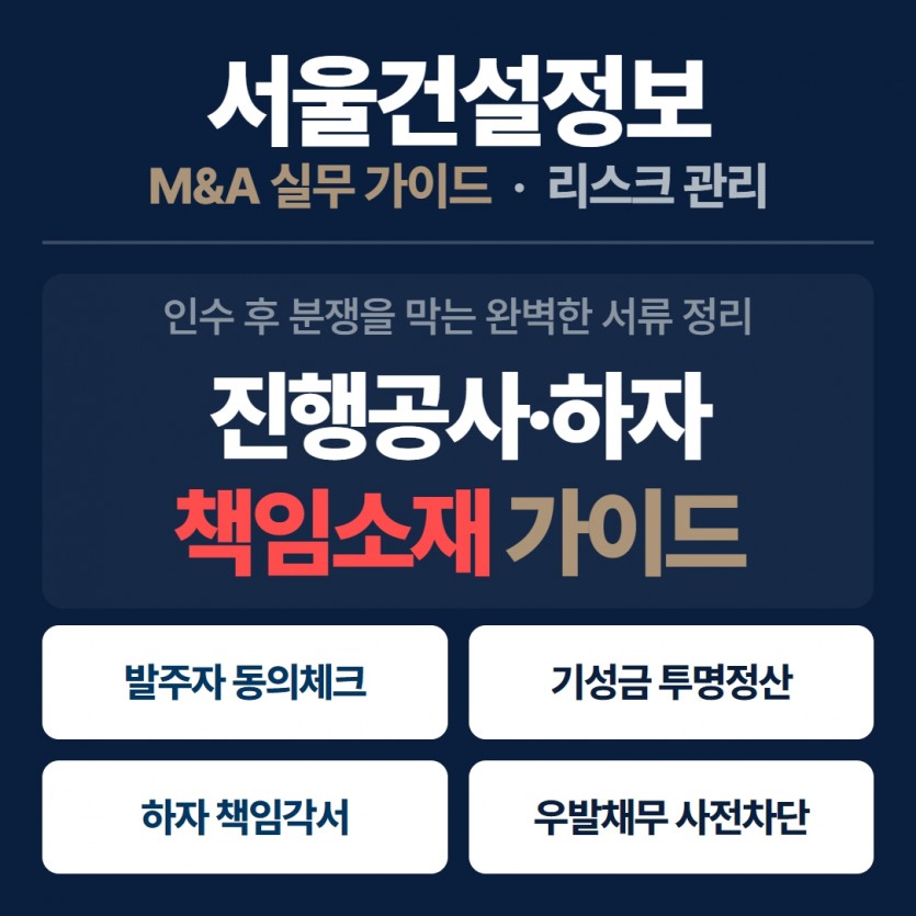 - 진행공사가 있는 법인을 인수할 때는 발주자 동의 가능성, 기성금 정산, 잔여 공정 범위를 먼저 확인해야 합니다.