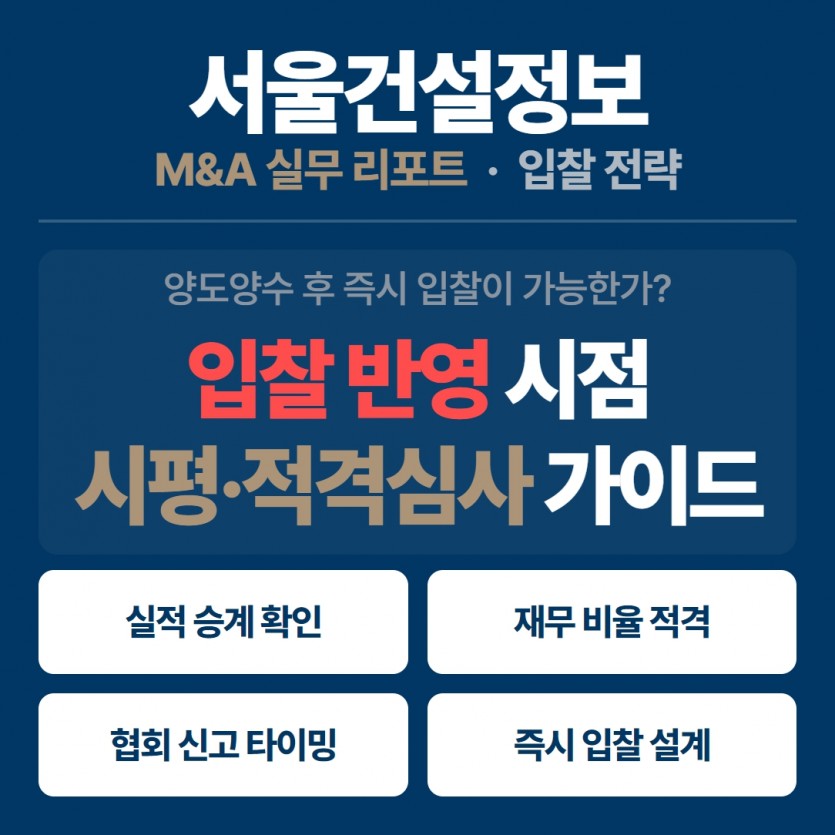 실제 서울건설정보 공지사항에서도 양도양수와 신규등록 비교 글에서 협회 기재사항 변경 신고와 실적 승계 신청 완료 후 입찰 참여를 설명하고 있고, 인수 전 필수 점검 글에서도 시공능력평가와 경영상태는 인수 후 숫자가 달라질 수 있다고 이미 안내하고 있습니다. 다만 이 주제를 정면으로 풀어낸 독립형 심화 글은 별도로 정리할 필요가 있습니다. :contentReference[oaicite:1]{index=1}