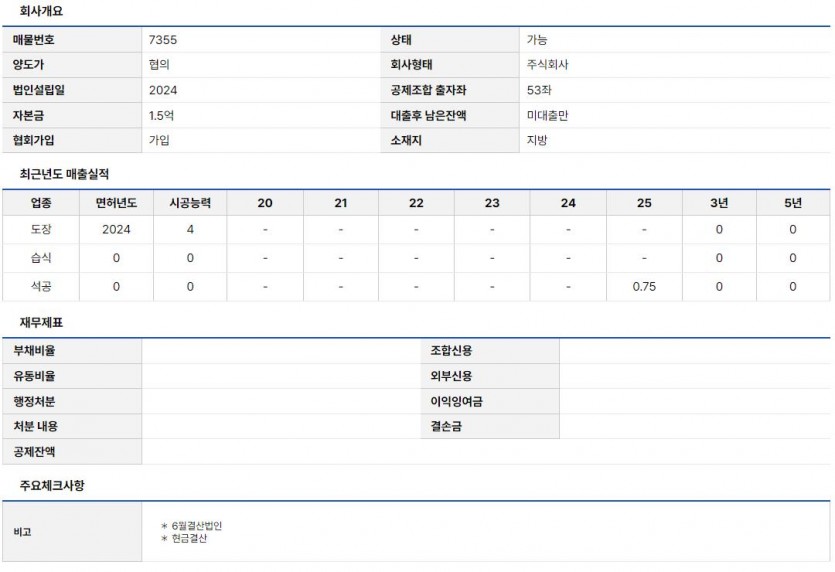 도장+습식+석공 양도 (매물 7355) | 6월 결산, 미대출, 실인수 2천만 대