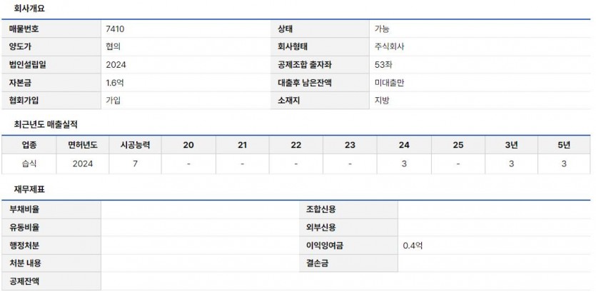 2024년 법인임에도 불구하고 약 4,000만 원의 이익잉여금을 보유하고 있습니다. 보통 신규 법인이 초기 비용으로 결손이 발생하는 것과 대조적으로, 내실 있게 운영되어 온 '알짜 매물'입니다.