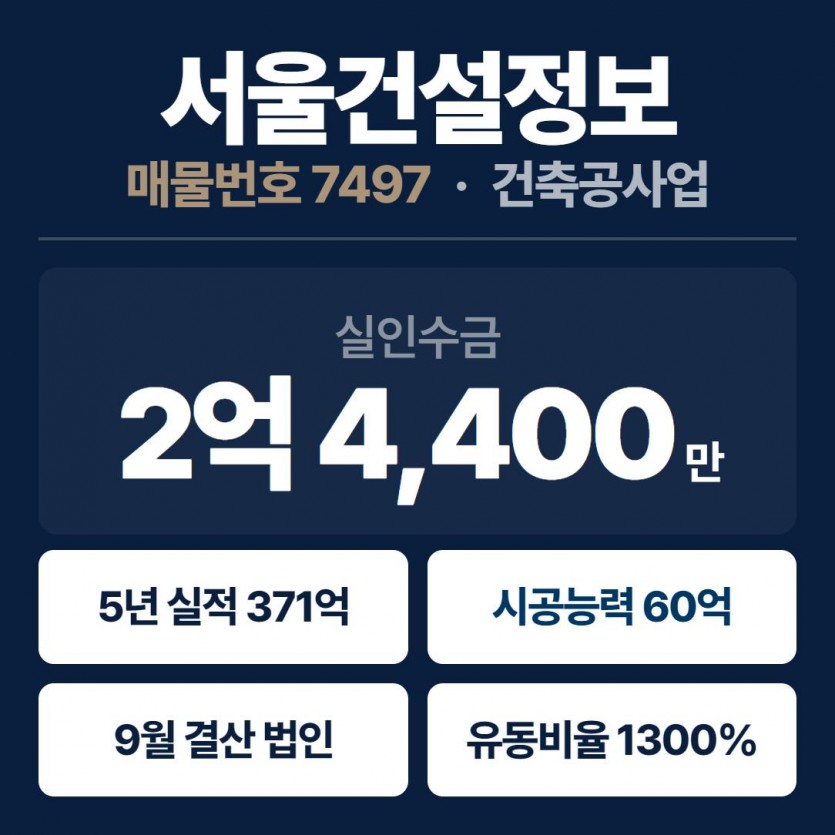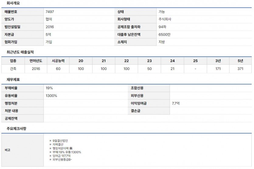 건축공사업 양도 (매물 7497) | 5년 실적 371억, 잉여금 7.7억, 9월 결산