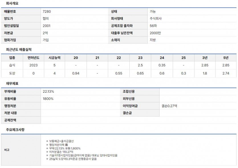 습식+도장공사업 양도 (매물 7280) | 2001년 법인, 양도가 8천, 실인수 6천
