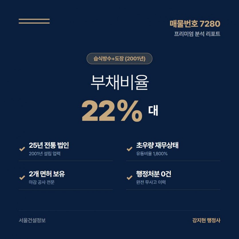 부채비율 22.13%, 유동비율 1,800%로 재무 상태가 건설업계 최상위 수준입니다. 입찰 적격심사에서 만점을 보장하며, 설립 이래 행정처분 이력이 전무하고 진행 중인 공사가 없어(No Risk) 즉시 깨끗한 출발이 가능합니다.