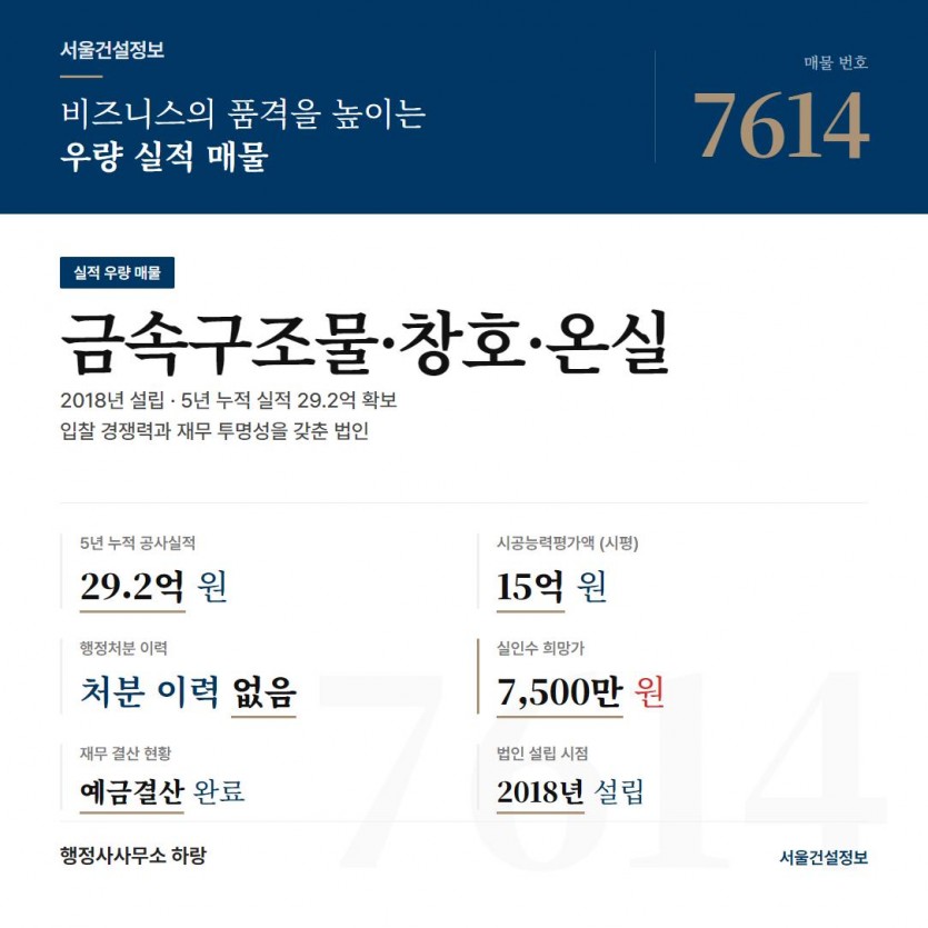 5년 실적 29.2억 확보 (매물 7614) | 시평 15억, 실인수 7천만 원대