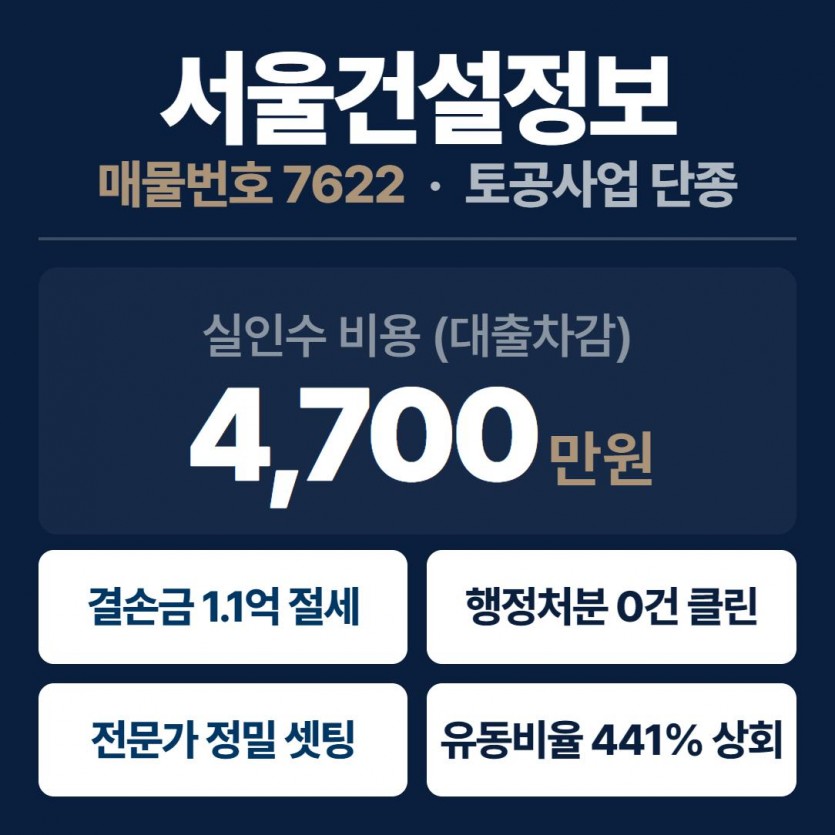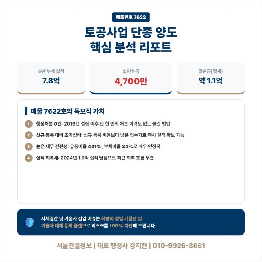 [SEO Info] 본 매물은 2016년 법인 설립 이후 단 한 건의 행정처분도 없는 깨끗한 공적 장부를 자랑하는 토공사업(매물번호 7622) 단종 면허입니다. 5년 누계 7.8억의 실적을 보유하고 있으며, 양도가 6,200만 원(실인수 약 4,700만 원)이라는 파격적인 조건으로 나왔습니다. 특히 약 1.1억 원의 미처분결손금을 보유하고 있어, 인수 후 발생하는 영업이익에 대한 법인세 절감 등 강력한 절세 효과(Tax Shield)를 기대할 수 있는 재무 특화 매물입니다. 자체결산 및 기술자 겸업 이슈는 하랑의 정밀 컨설팅을 통해 안전하게 통제됩니다.
