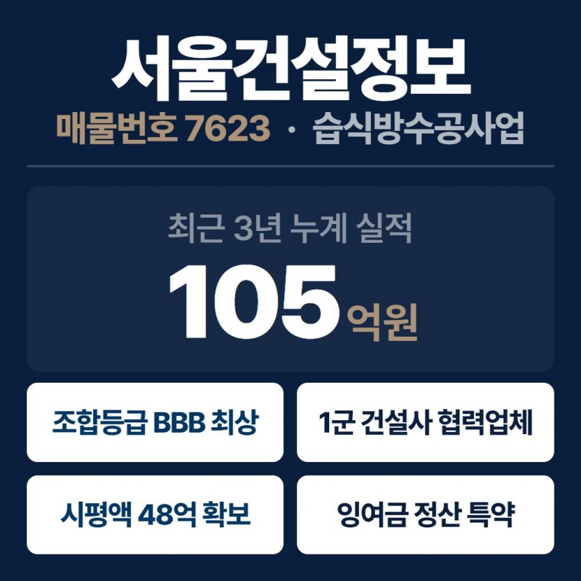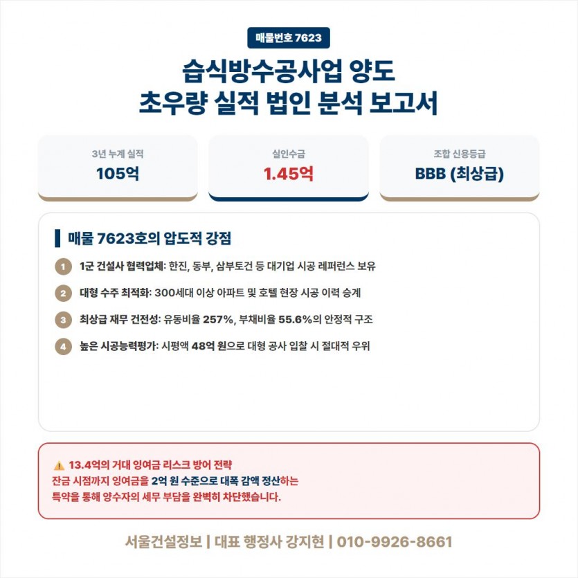 [SEO Info] 본 매물은 2001년 면허를 취득한 수도권 소재의 습식방수공사업(매물번호 7623) 법인입니다. 한진, 동부, 삼부토건 등 1군 대기업 협력업체 시공 이력을 바탕으로 최근 3년 누계 105억 원이라는 압도적인 초우량 실적을 달성했습니다. 공제조합 신용등급 역시 최상급인 BBB 등급을 유지하여 대형 입찰 및 보증서 발급에 매우 유리합니다. 양도가 2.1억 원(실인수 약 1.45억 원)으로 책정되었으며, 장부상 13.4억 원의 잉여금은 잔금 시점까지 2억 원 수준으로 대폭 조정하는 조건을 걸어 양수자의 세무 리스크를 완벽하게 차단한 하이엔드(High-End) 매물입니다.