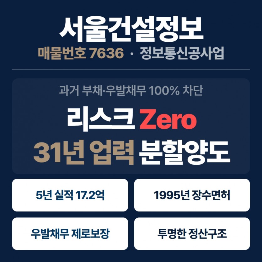 - • 완벽한 리스크 차단 : 기존 법인의 뼈대를 버리고 오직 정보통신공사업 면허와 실적만 깔끔하게 도려내어 양수자에게 합병시키는 '분할 양도' 조건입니다. 양수자는 기존 법인의 숨겨진 채무, 세금 체납, 현장 하자 보수 책임으로부터 100% 면책받는 가장 안전한 인수 방식입니다.