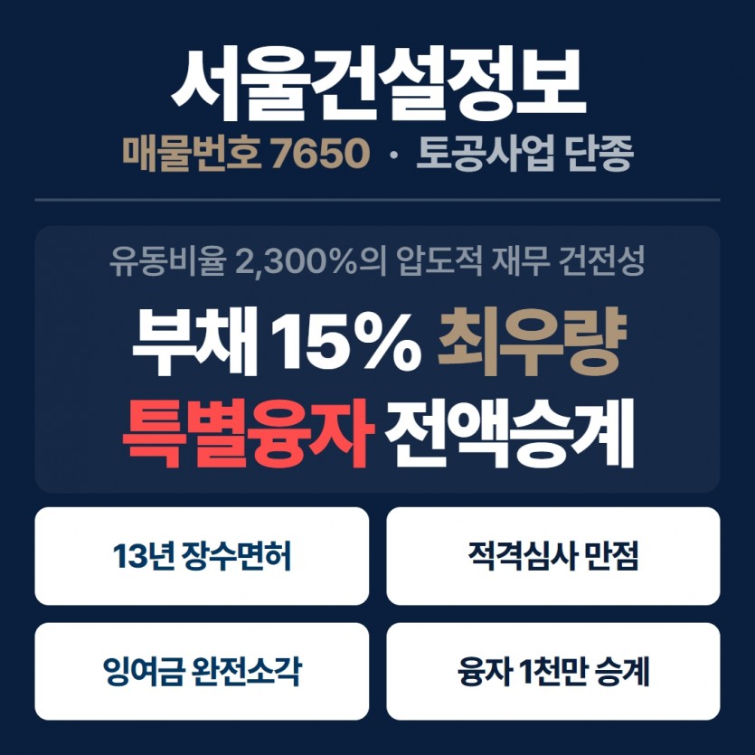 | 인수 추천 | 관급 공사 입찰 요건 충족 및 특별융자 승계로 초기 자금 부담을 줄이려는 기업 |
