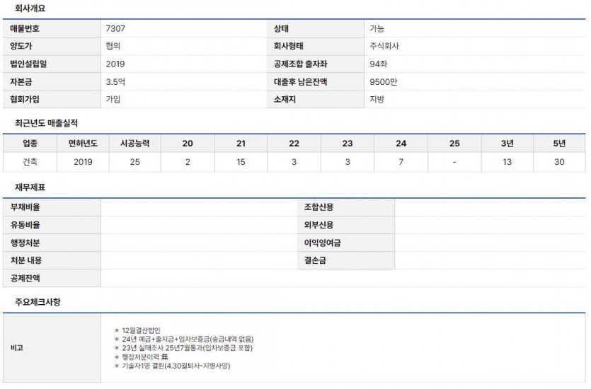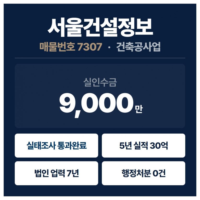 건축공사업 양도 (매물 7307) | 2019년, 실인수 9천만, 실태조사 통과