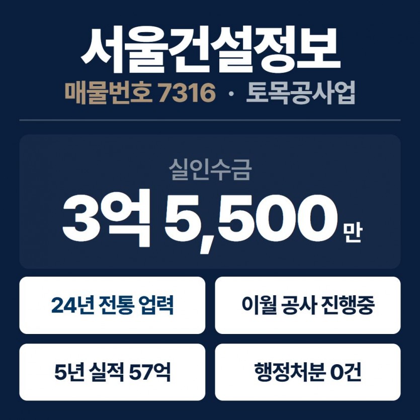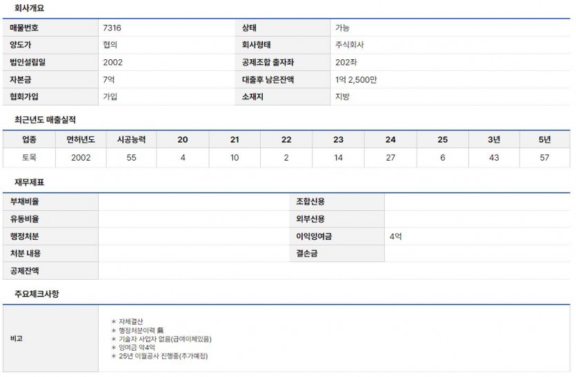 토목공사업 양도 (매물 7316) | 24년 업력, 57억 실적, 이월공사 보유