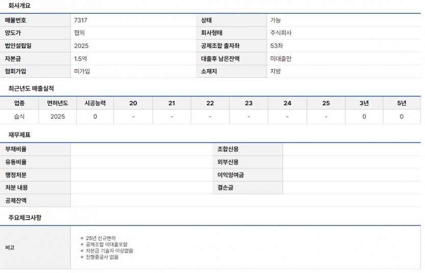 2025년에 설립된 신규 법인으로 과거 공사 이력이나 채무 관계가 전혀 없는 백지상태의 깨끗한 법인입니다. 진행 중인 공사도 없어 인수 후 우발 채무나 하자 보수 등 잠재적 리스크가 0%인 완벽한 안전 매물입니다.