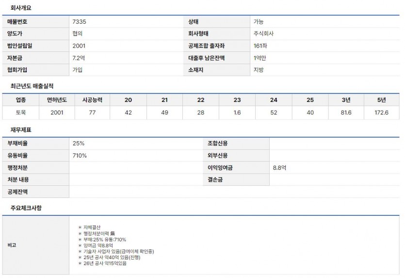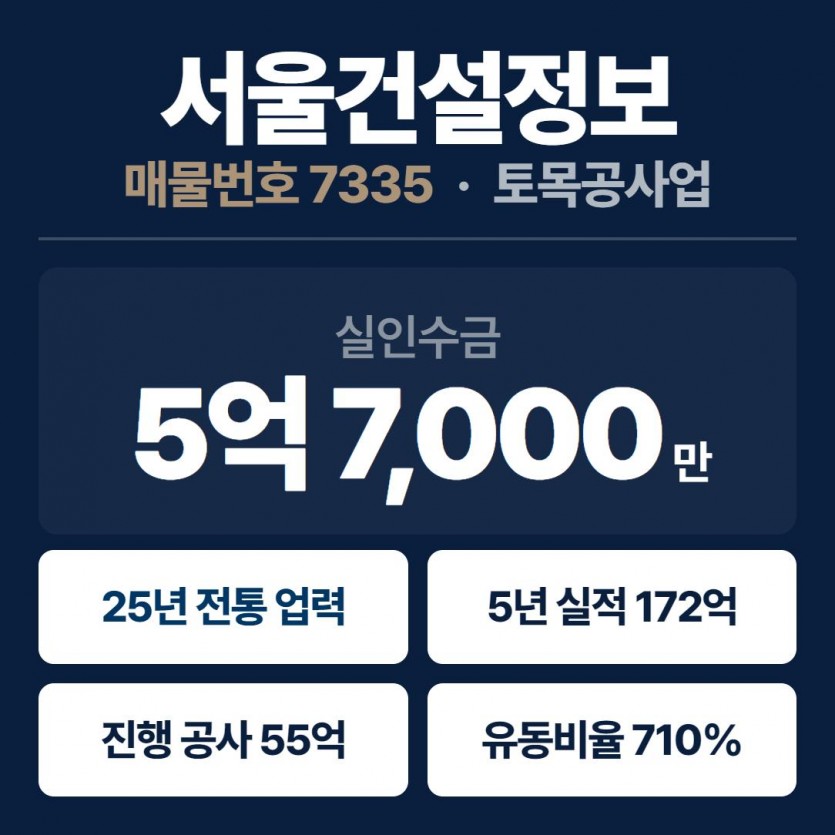 토목 양도 (매물 7335) | 25년 업력, 5년 실적 172.6억, 진행공사 55억